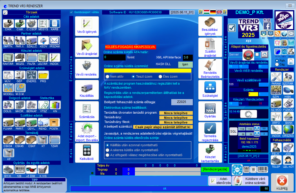 Főkönyvi feladás kimenő számlák, készletmozgások, bejövő számlák automatikus feladása.